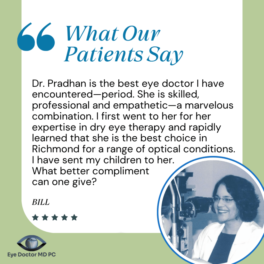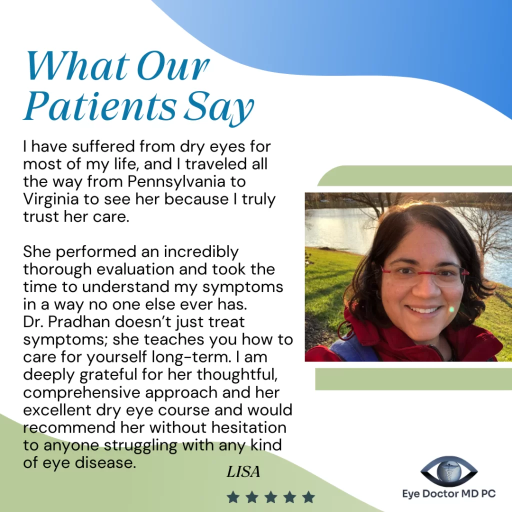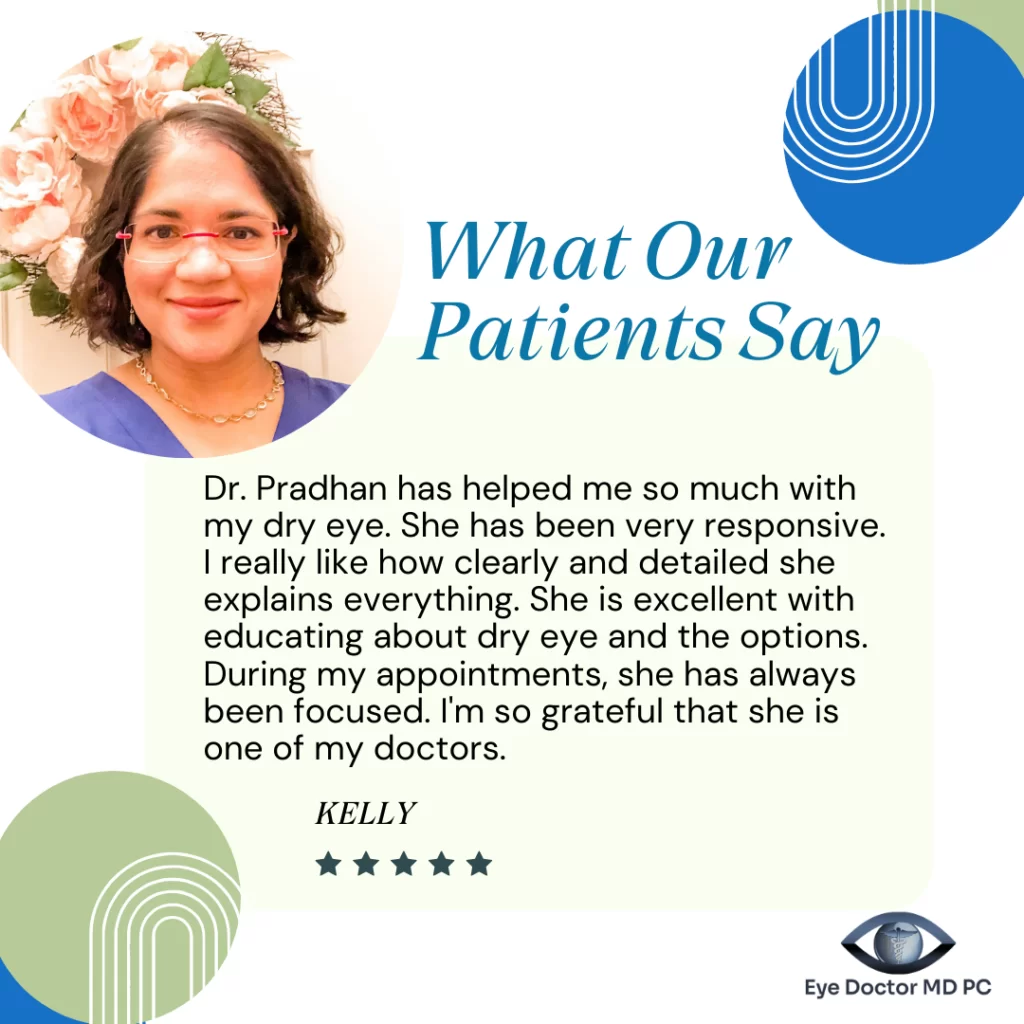 For patients suffering from dry eye disease, Dr. Pradhan provides modern treatment options such as IPL (Intense Pulsed Light), OptiLift, and OptiPlus—technologies designed to target the underlying causes of dry eye and provide longer-lasting relief. But treatment goes beyond in-office procedures. Dr. Pradhan believes that patient education is essential. She works closely with patients to help them understand the root causes of their symptoms, along with lifestyle adjustments and environmental changes that can significantly improve long-term eye health.