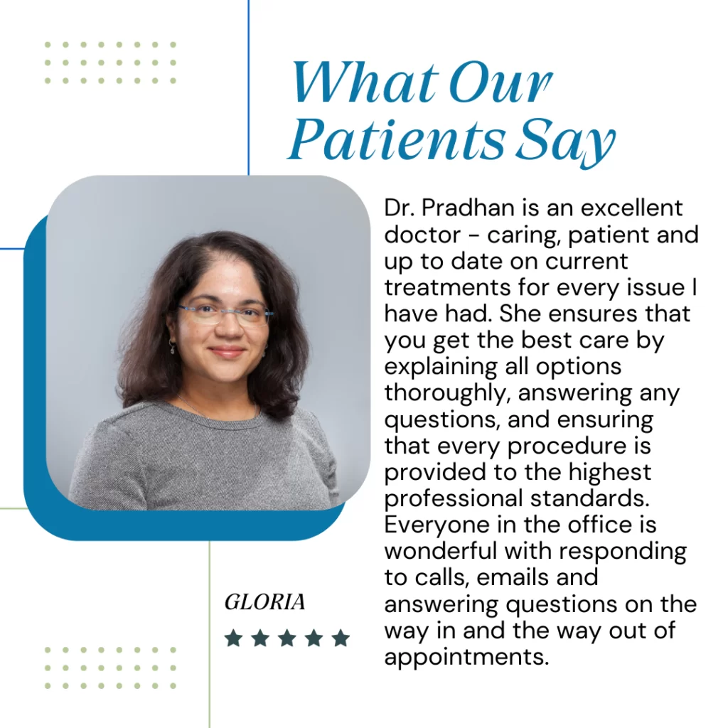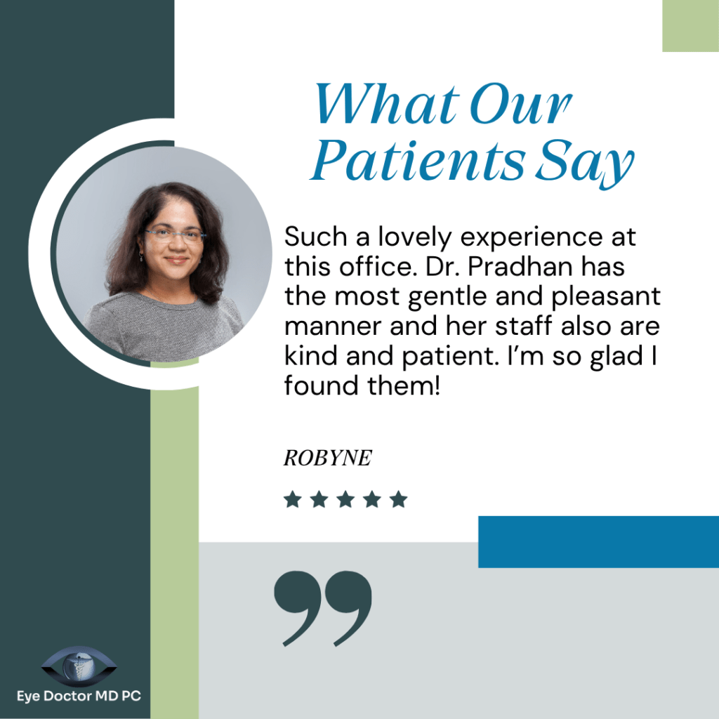 At the heart of Dr. Pradhan’s care is a deep commitment to staying at the forefront of medicine. She continually studies the latest research to keep up with the ever-changing landscape of healthcare and integrates evidence-based innovations into patient care. This dedication allows her to offer advanced technologies designed to address the root cause of eye conditions—not just the symptoms.